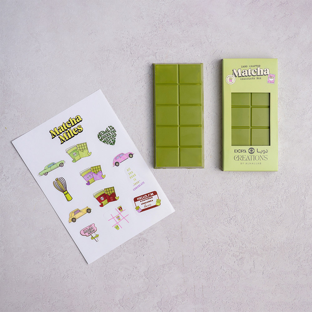 A white matcha chocolate with a crispy matcha filling. Each bar comes with an exclusive set of customized stickers.